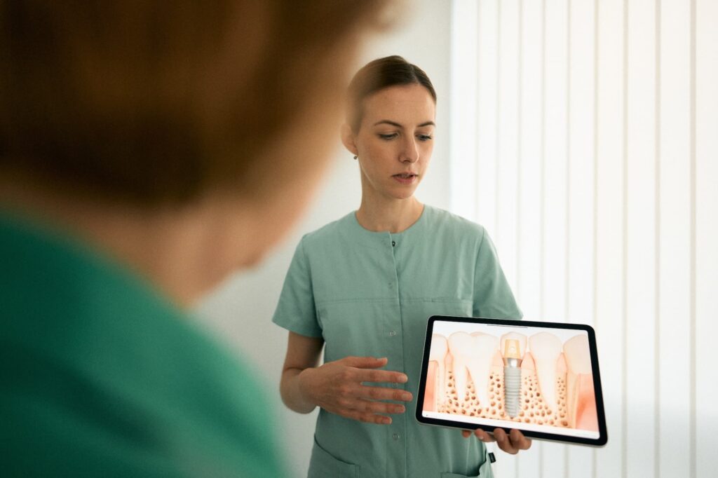Ein Implantat ersetzt die natürliche Zahnwurzel und wird fest im Kiefer verankert. Es bietet Stabilität, Langlebigkeit und ein sicheres Gefühl – beim Kauen, Sprechen und Lächeln. Mit präziser Planung und strukturierter Nachsorge bieten wir für ein verlässliches Ergebnis.